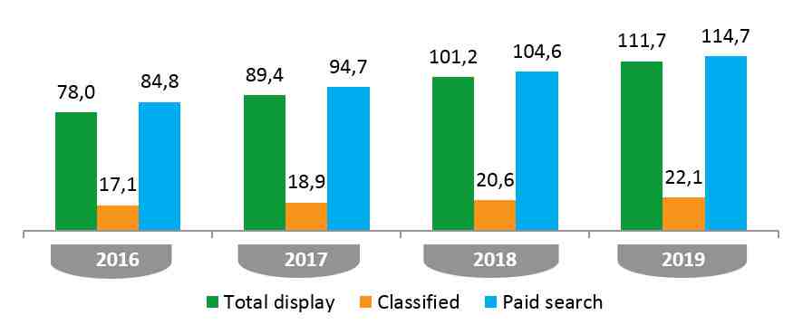 Online video advertising is growing almost as quickly as social media, at 18% a year, and by 2019 it will total US$35.4bn across the world, fractionally ahead of the amount spent on radio advertising (US$35.0bn). Online video is also benefiting from the spread of mobile devices, as well as the development of high-speed mobile data connections and improvements in handset displays. It is becoming common for brands to use online video as a complement to television, but for most it does not make sense to use it as a substitute. Even by 2019 online video advertising will be less than a fifth (18%) of the size of television advertising.