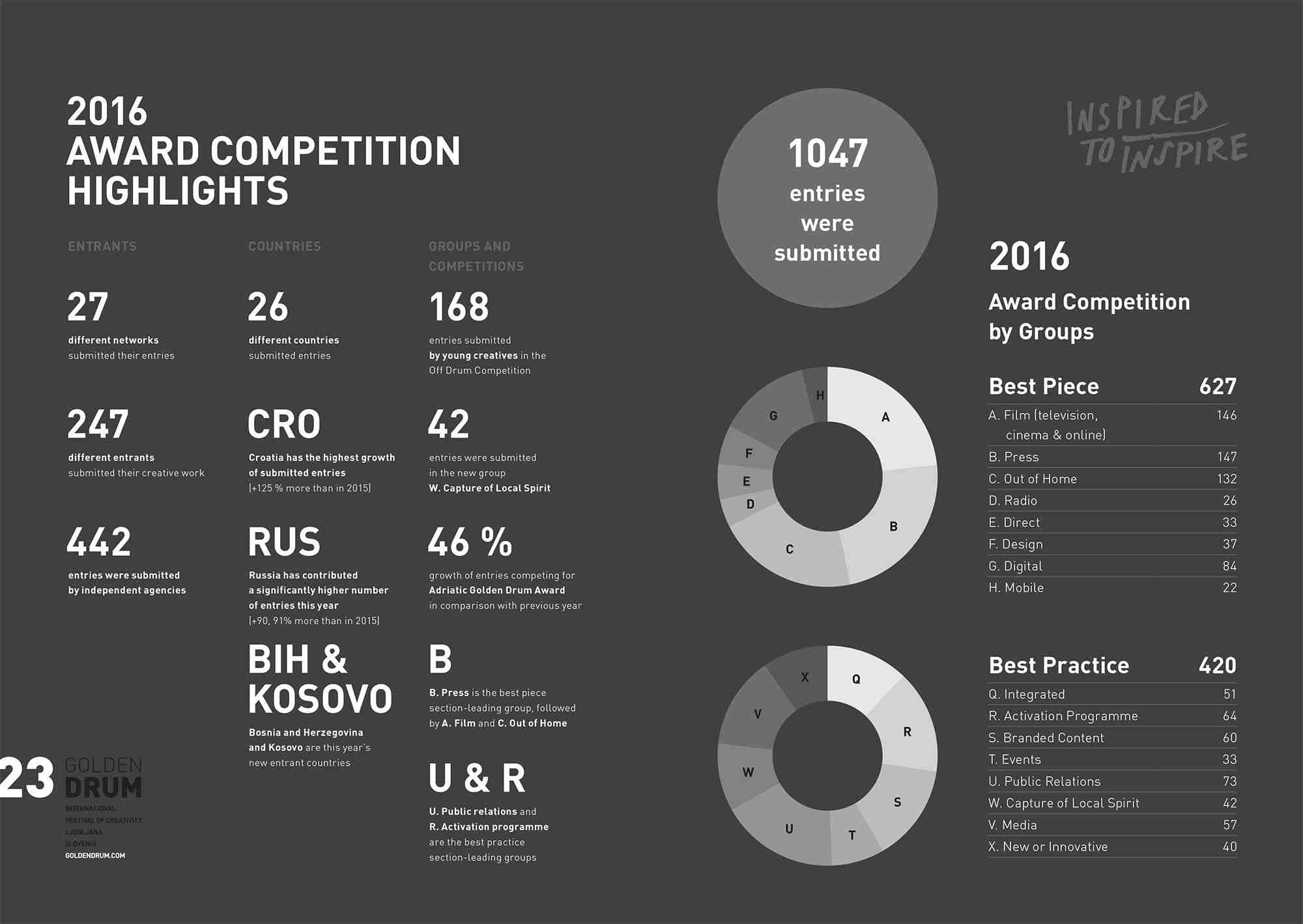 23. Golden Drum je ove godine u takmičarski program uvrstio brojne novosti. Najviše prijavljenih radova u sekciji »Najbolja praksa« imaju skupine Public Relations (73), Activation programme (64) i Brended Content (60), u sekciji »Najbolji rad« skupina Press (147), slijede je Film (146) i Out of Home (132).