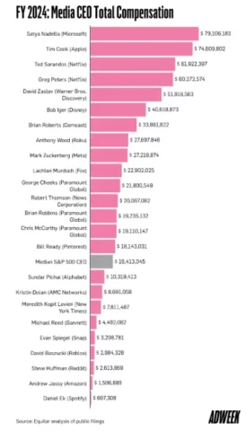 Izvršni direktor Microsofta, Satya Nadella, bio je u 2024. godini najbolje plaćeni direktor jedne medijske kompanije. Na vrhu liste našli su se i glavni direktor Applea, Tim Cook, te izvršni direktori Netflixa, Ted Sarandos i Greg Peters.