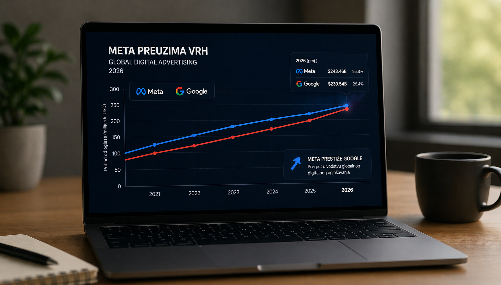 Meta Platforms bi u 2026. godini mogla napraviti ono što se donedavno činilo malo vjerovatnim i preuzeti vodeću poziciju u globalnom digitalnom oglašavanju od Google. Prema procjenama Emarketera, riječ je o simboličnom, ali važnom trenutku koji pokazuje kako se ravnoteža snaga na tržištu mijenja.