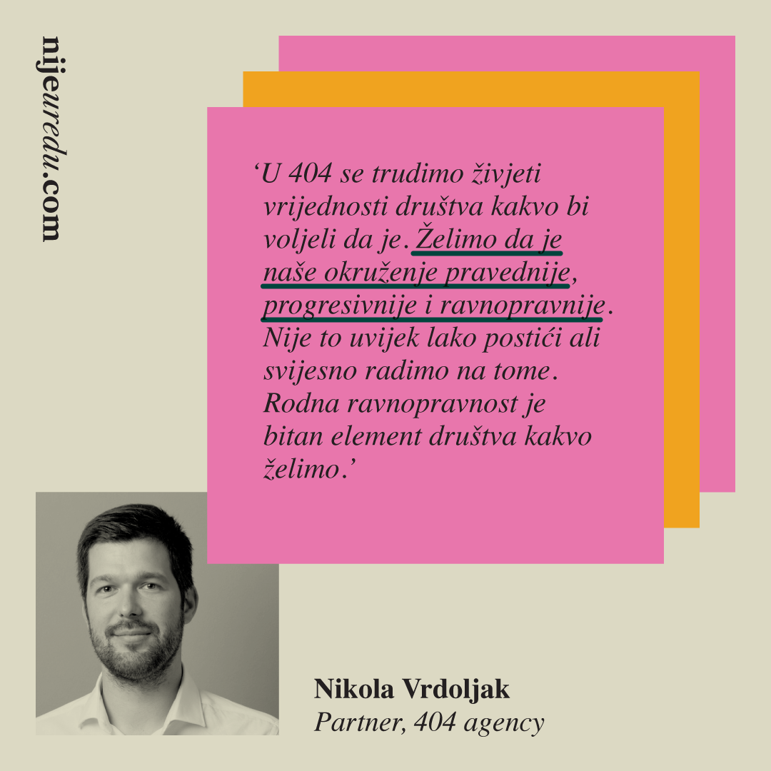 Ovih dana oglasne površine diljem Hrvatske preplavile su provokativne poruke: Prirodno je da su im plaće manje. / Nek se posvete obitelji umjesto karijeri. / Više brinu o izgledu nego o poslu. / Imaju manje smisla za biznis. Ako su i vas zaintrigirale, prije nego nastavite čitati, posjetite nijeuredu.com i testirajte svoju osviještenost o ovom pitanju: jesu li vas na prvu asocirale na muškarce ili žene?
