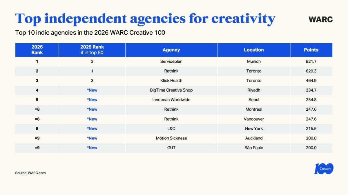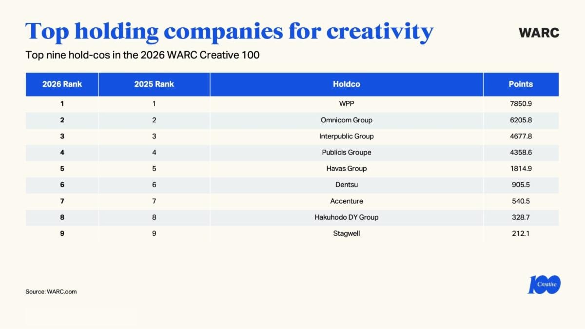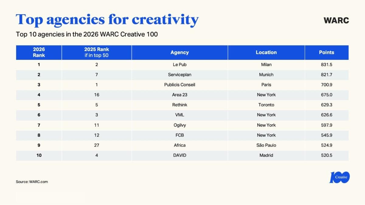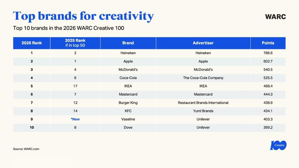 WARC je objavio Creative 100 Ranking za 2026. godinu, globalni nezavisni pregled najnagrađivanijih kampanja i kompanija za kreativnost u marketingu. Rang lista se temelji na rezultatima najvažnijih međunarodnih i regionalnih kreativnih nagrada iz 2025. godine.